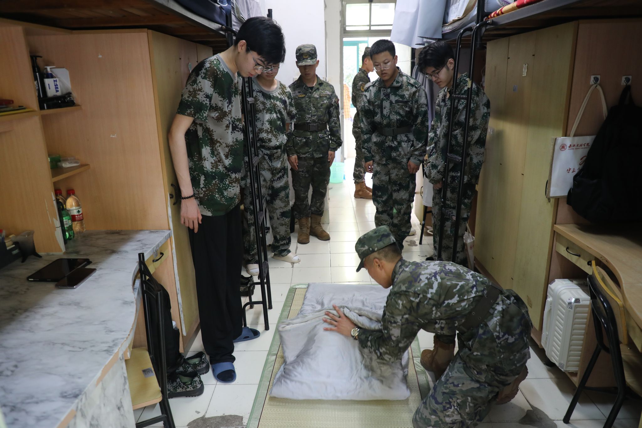 动员大会后,军训教官和参加军训的全体同学见面。1日下午,军训教官来到学生宿舍,就内务整理进行指导。